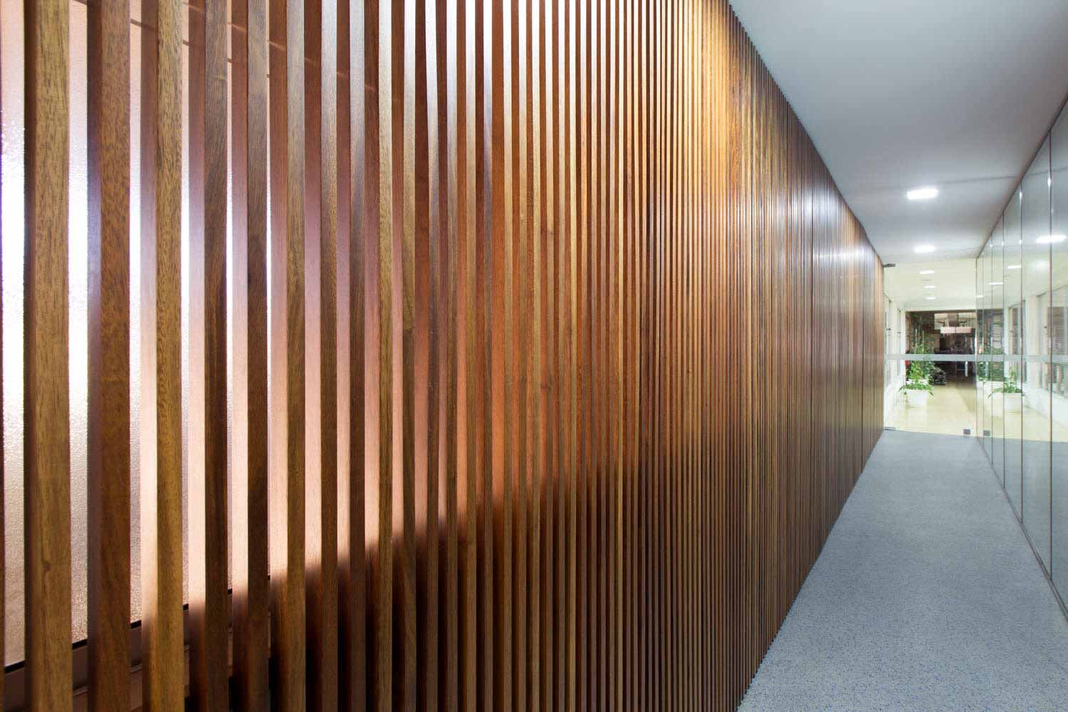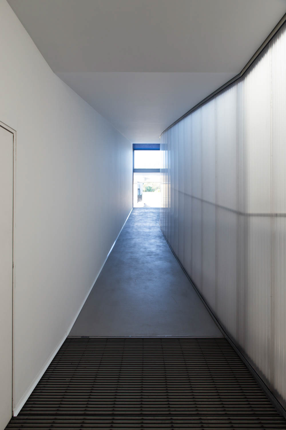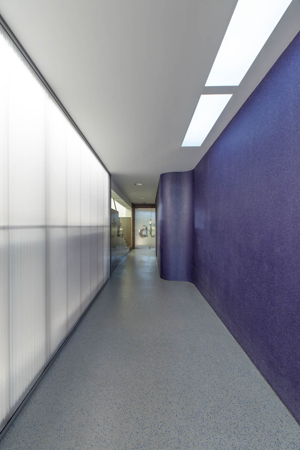 Elementos em policarbonato foram introduzidos pontualmente, funcionando como filtros de luz e divisórias translúcidas que conferem dinamismo aos espaços. Estes materiais criam reflexos subtis e sombras projetadas, que variam ao longo do dia e enriquecem a experiência espacial. O mobiliário segue uma linguagem contemporânea, com linhas simples e materiais duráveis, reforçando o caráter técnico e funcional da intervenção.