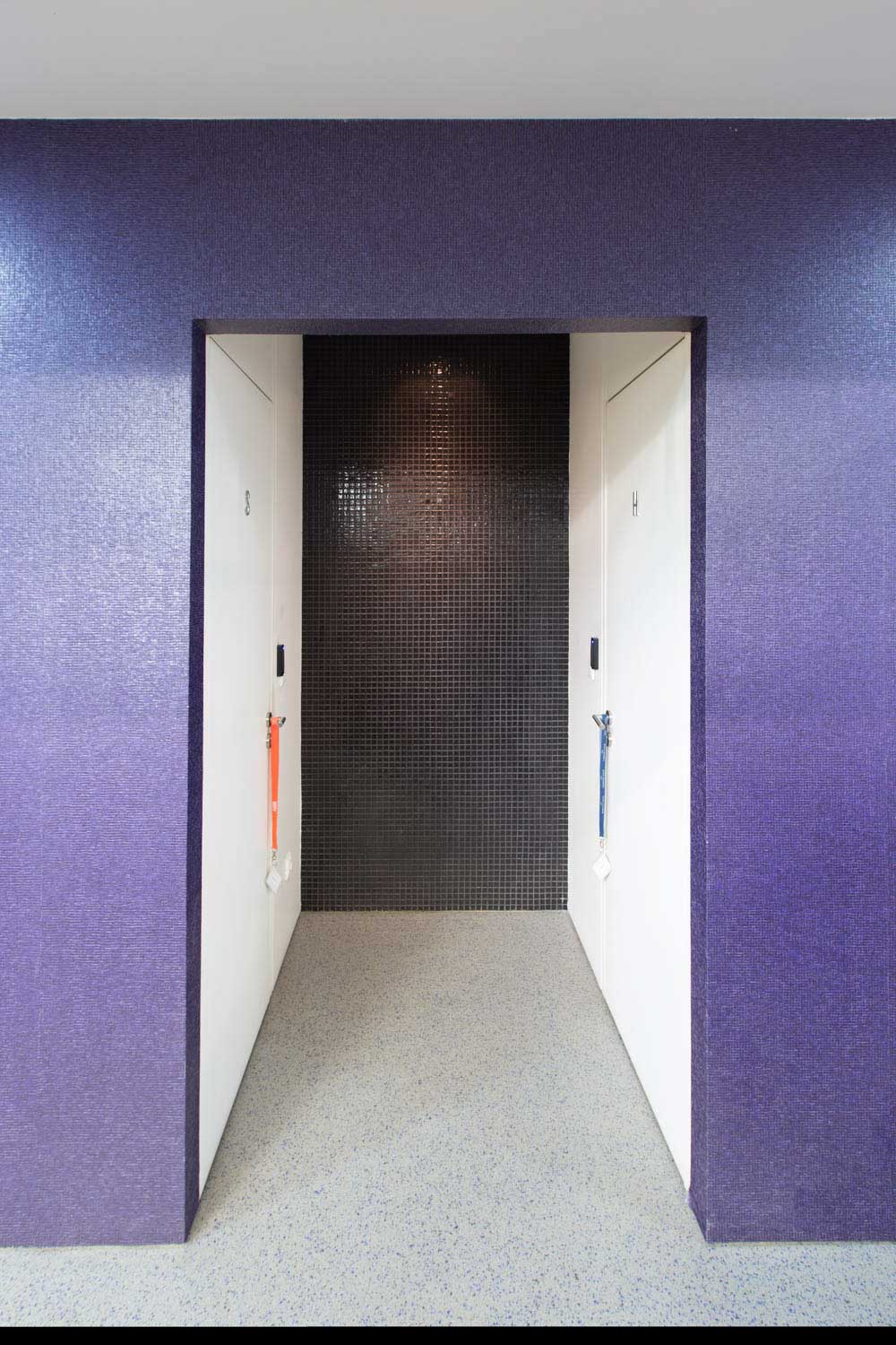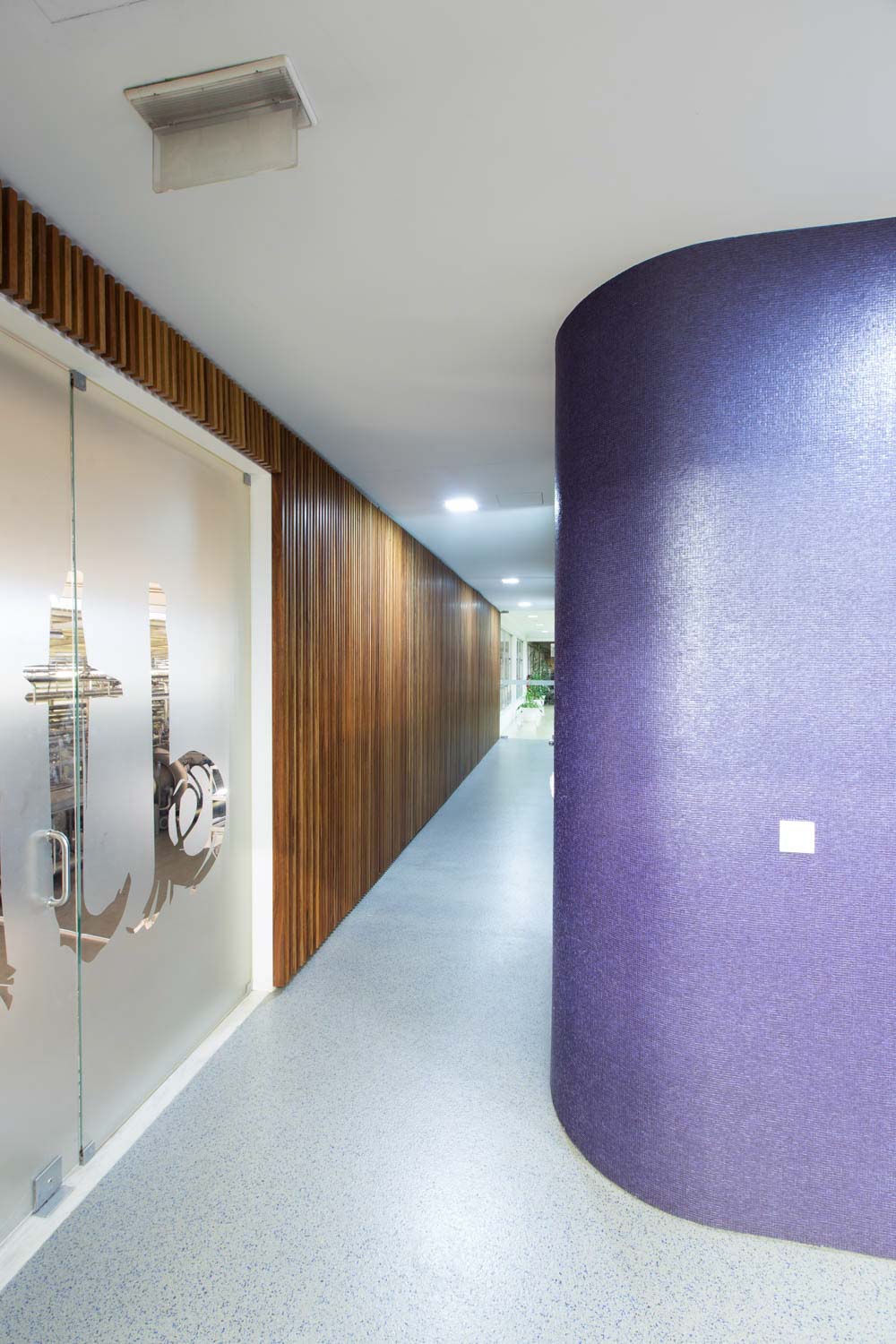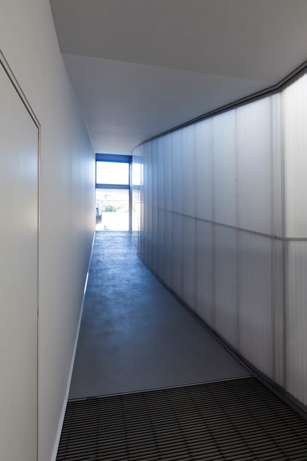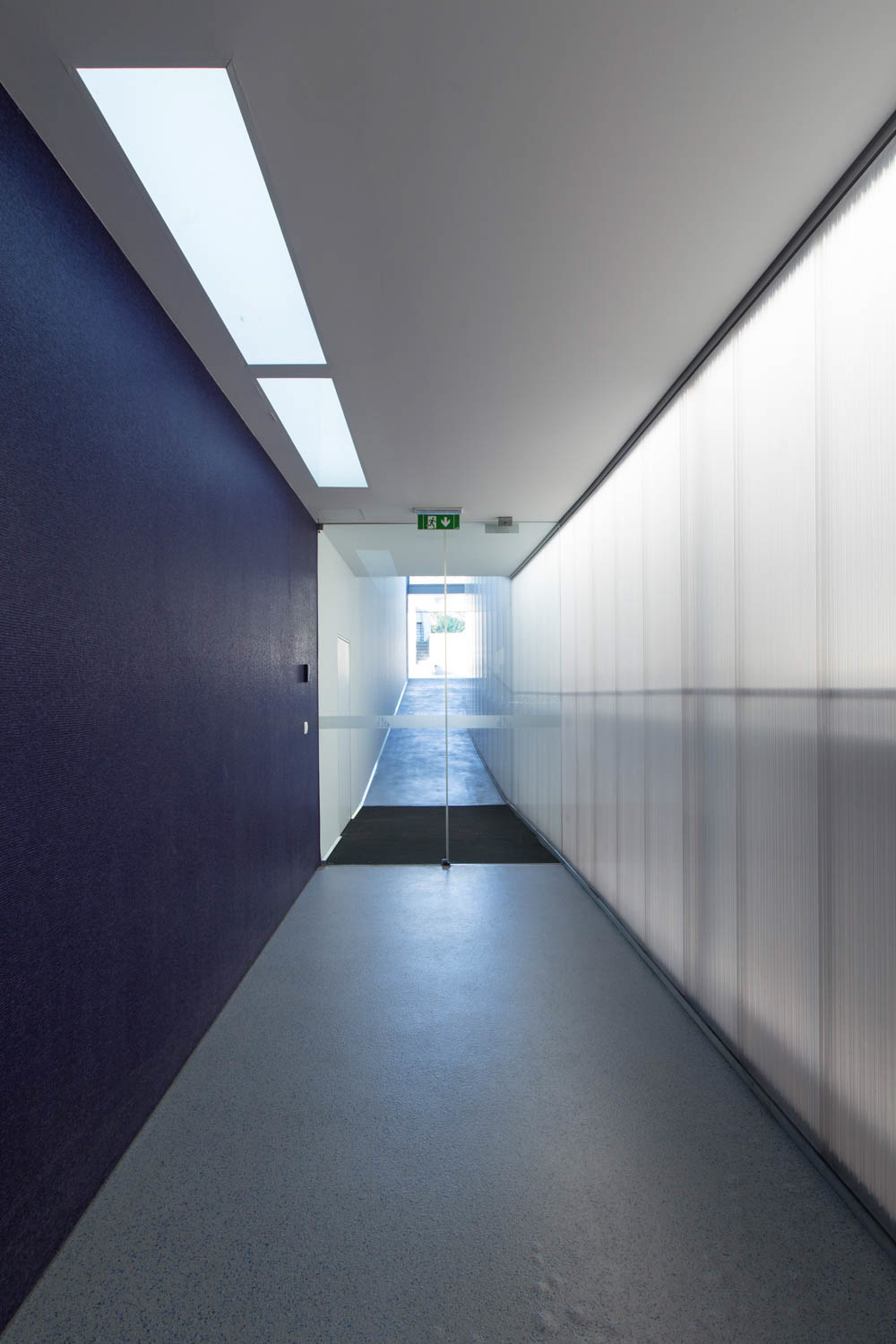 Elementos em policarbonato foram introduzidos pontualmente, funcionando como filtros de luz e divisórias translúcidas que conferem dinamismo aos espaços. Estes materiais criam reflexos subtis e sombras projetadas, que variam ao longo do dia e enriquecem a experiência espacial. O mobiliário segue uma linguagem contemporânea, com linhas simples e materiais duráveis, reforçando o caráter técnico e funcional da intervenção.