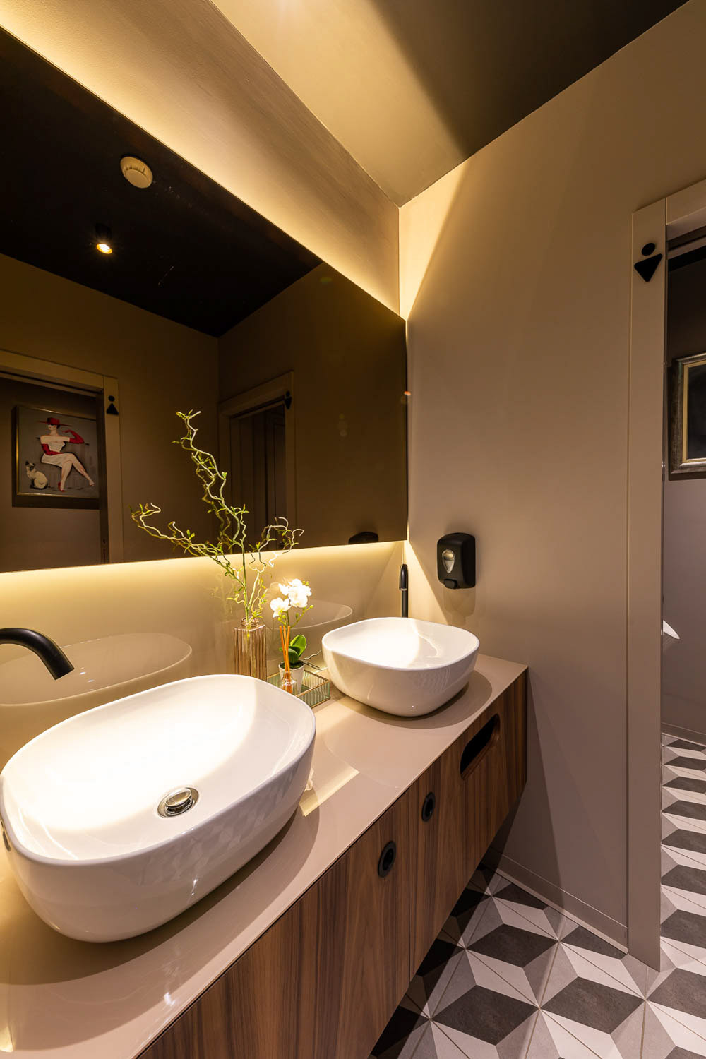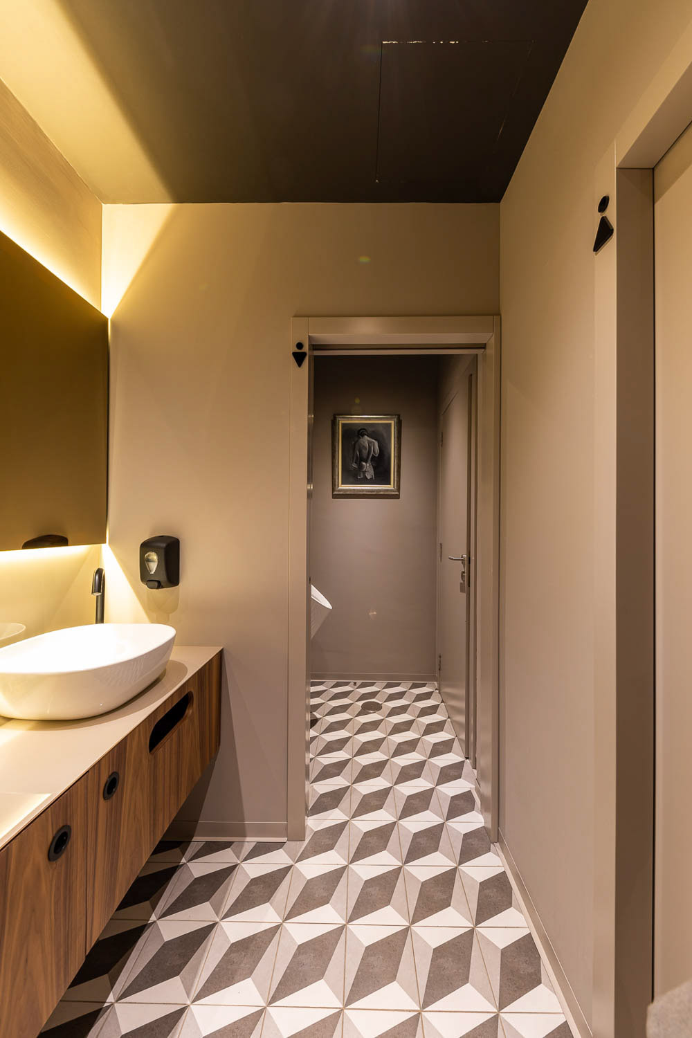 O restaurante, de planta estreita e alongada, organiza-se em torno de uma circulação central, ladeada por áreas de refeição que conduzem naturalmente o visitante até ao balcão de atendimento. Este elemento funciona como ponto de encontro entre clientes e equipa, estabelecendo ligação visual entre a zona de serviço e a copa, sem comprometer a fluidez do espaço. A disposição racional favorece a proximidade e a funcionalidade, essenciais na dinâmica do restaurante.