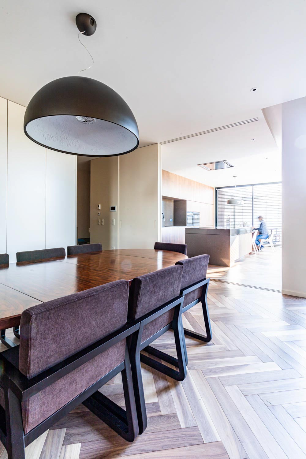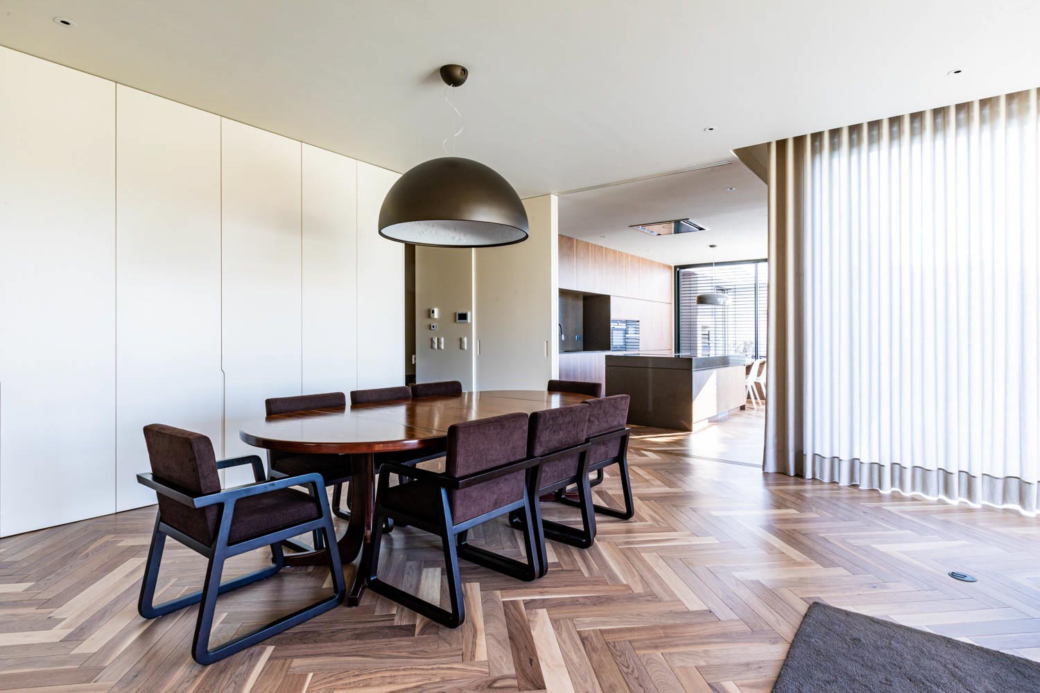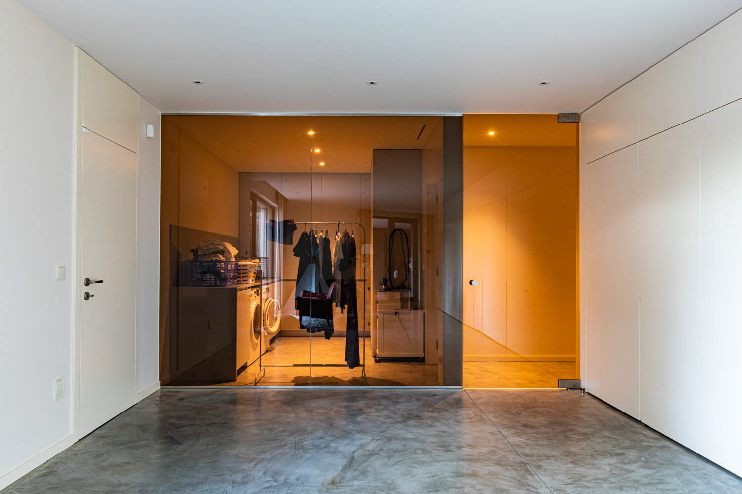 No que diz respeito à organização do programa, o rés-do-chão integra o comércio independente e a habitação, incluindo zonas de apoio, garagem coberta, sala polivalente, lavandaria e áreas técnicas. O primeiro andar é dedicado às zonas sociais e privadas, com sala comum, cozinha, quatro suítes e dois terraços que se conectam diretamente ao logradouro. A circulação centralizada torna a ligação entre os espaços fluida, ao mesmo tempo que reduz a área dedicada à circulação, aumentando a funcionalidade do edifício.