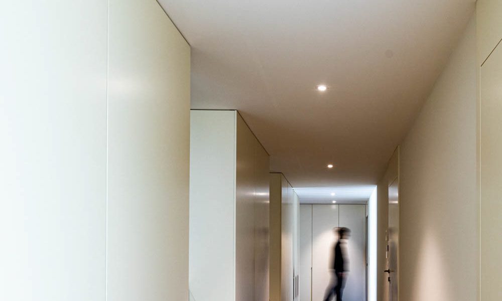 No que diz respeito à organização do programa, o rés-do-chão integra o comércio independente e a habitação, incluindo zonas de apoio, garagem coberta, sala polivalente, lavandaria e áreas técnicas. O primeiro andar é dedicado às zonas sociais e privadas, com sala comum, cozinha, quatro suítes e dois terraços que se conectam diretamente ao logradouro. A circulação centralizada torna a ligação entre os espaços fluida, ao mesmo tempo que reduz a área dedicada à circulação, aumentando a funcionalidade do edifício.