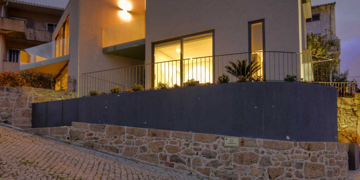 A fachada foi tratada com tons neutros e materiais de textura suave, estabelecendo um diálogo harmonioso com o muro em pedra existente. A utilização de superfícies claras e volumetrias contidas reforça a integração com o contexto e evita contrastes abruptos. No interior, a casa unifamiliar Barcelos privilegia ambientes luminosos e materiais naturais – madeira, pedra e gesso –, criando uma atmosfera serena e acolhedora.