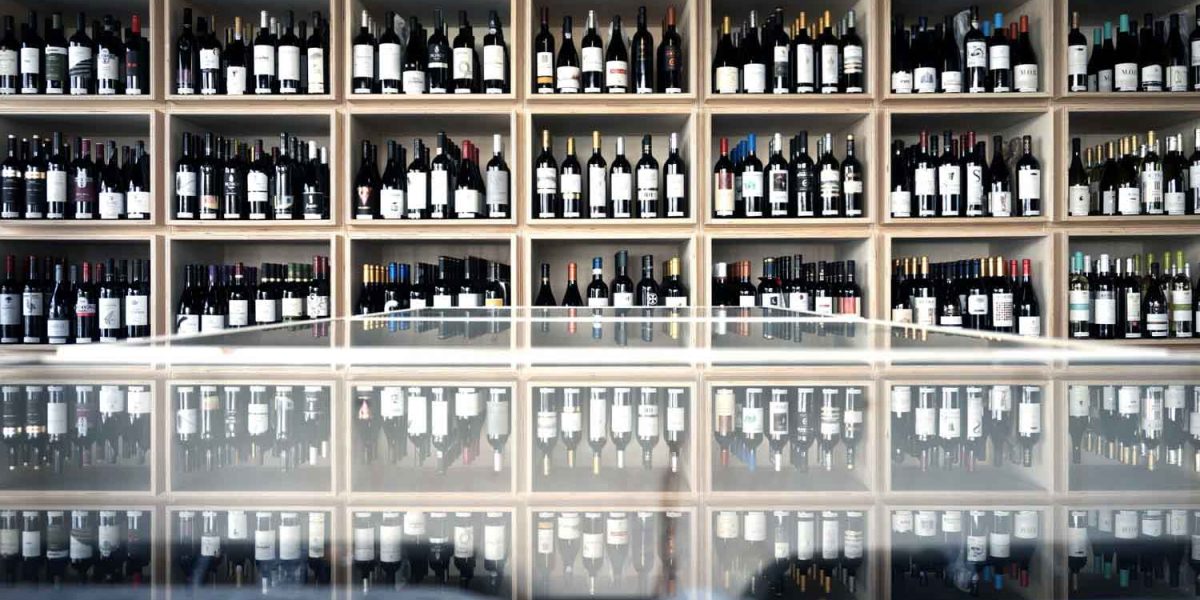 As paredes laterais são revestidas por módulos expositores em madeira clara, inspiradas nas caixas de transporte de vinho, concebidos como grelhas contínuas que conferem ordem, ritmo e uniformidade.