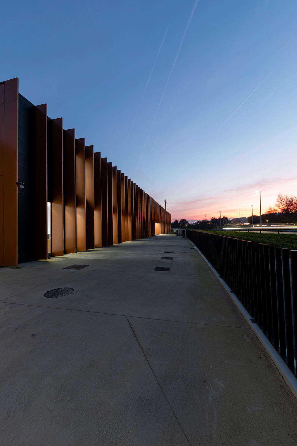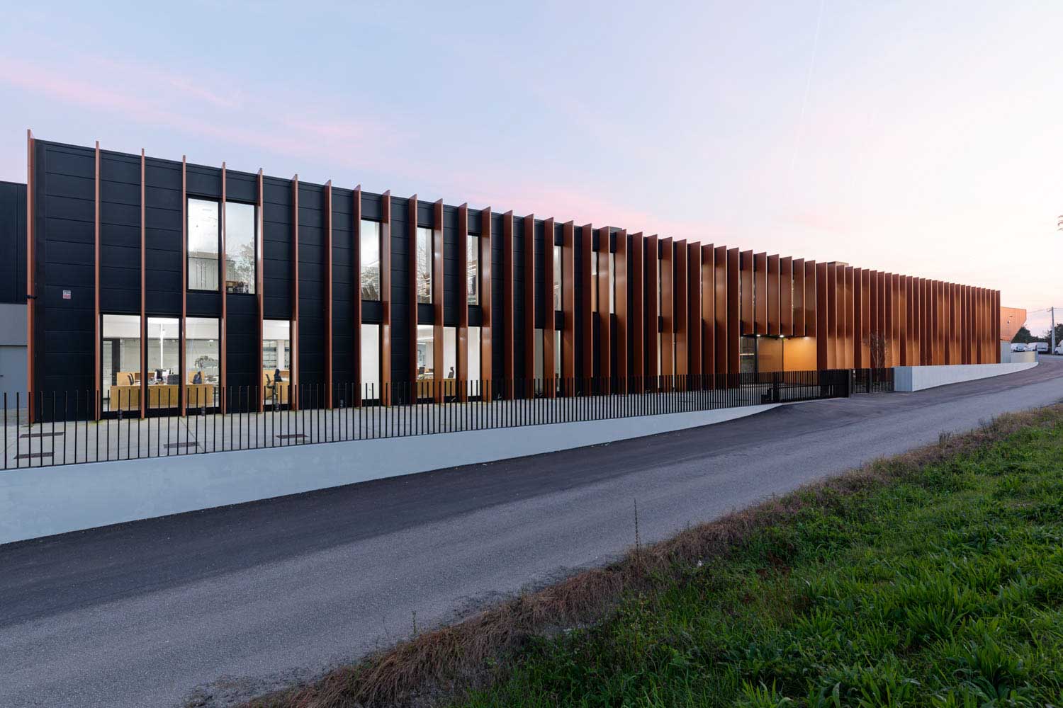 O projeto industrial Barcelos surge da necessidade de substituir as antigas instalações da empresa Ribeiro e Campos, que já não respondiam às exigências técnicas e espaciais da atividade. Localizado junto à variante de Barcelos, o novo edifício assume-se como uma peça arquitetónica funcional e representativa, pensada para melhorar as condições de trabalho, otimizar fluxos de produção e consolidar a identidade corporativa da marca. A estrutura geral organiza-se em três zonas distintas e complementares. A nave central, ampla e flexível, é dedicada à produção e armazenagem, permitindo reconfigurações futuras conforme as necessidades industriais. O corpo voltado para a Rua Luís de Camões acolhe os espaços administrativos, showroom, receção e gabinetes de direção, funcionando como a face institucional da empresa. O volume orientado para a Rua do Cruzeiro foi concebido para servir os funcionários, incluindo vestiários, refeitório, gabinete médico e sala de formação. Esta separação funcional garante percursos independentes e seguros para trabalhadores, visitantes e veículos, otimizando a eficiência e reduzindo interferências operacionais. A arquitetura do projeto industrial Barcelos equilibra solidez e transparência. As fachadas alternam betão aparente, vidro e painéis metálicos perfurados, conferindo ritmo e leveza ao conjunto. A iluminação natural desempenha um papel essencial, atravessando os espaços produtivos e administrativos para criar ambientes confortáveis e energeticamente eficientes. No interior, as cores neutras, os pavimentos contínuos e os revestimentos duráveis asseguram funcionalidade e fácil manutenção. O edifício traduz uma imagem de modernidade e rigor técnico. O projeto industrial Barcelos demonstra que é possível conjugar eficiência produtiva, qualidade estética e sustentabilidade ambiental, criando um espaço de trabalho que valoriza o ser humano e reflete a inovação e o compromisso da empresa Ribeiro e Campos com o futuro.